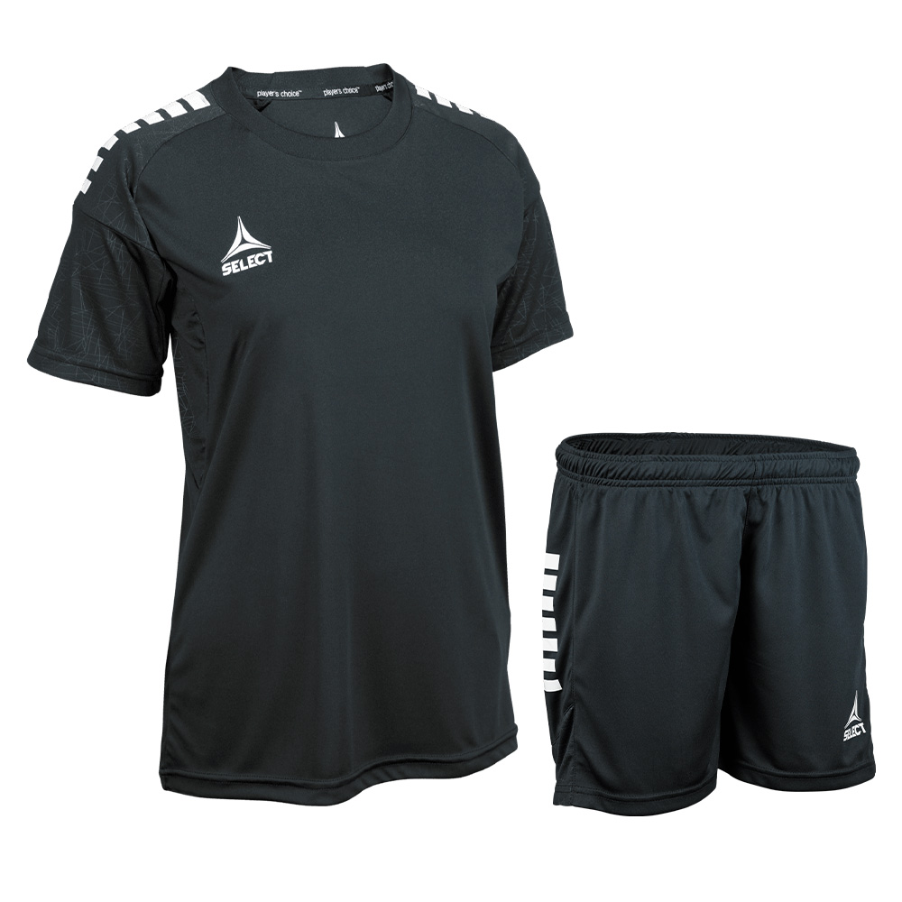• Camiseta de juego y entrenamiento color negro con vivos blancos. Short negro con vivos Blancos