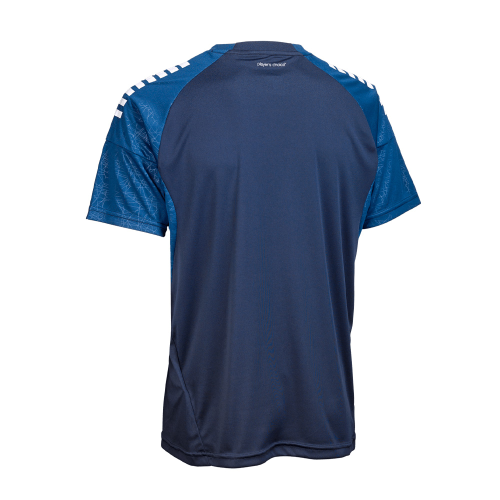 • Camiseta de juego y entrenamiento color navy con vivos blancos. Short navy con vivos Blancos